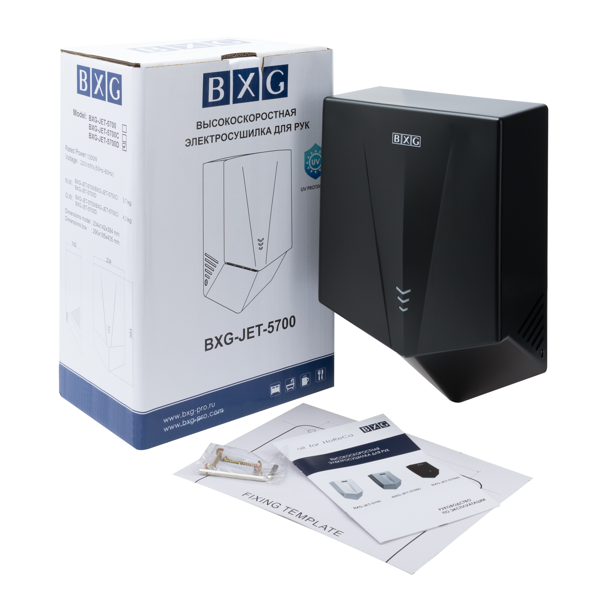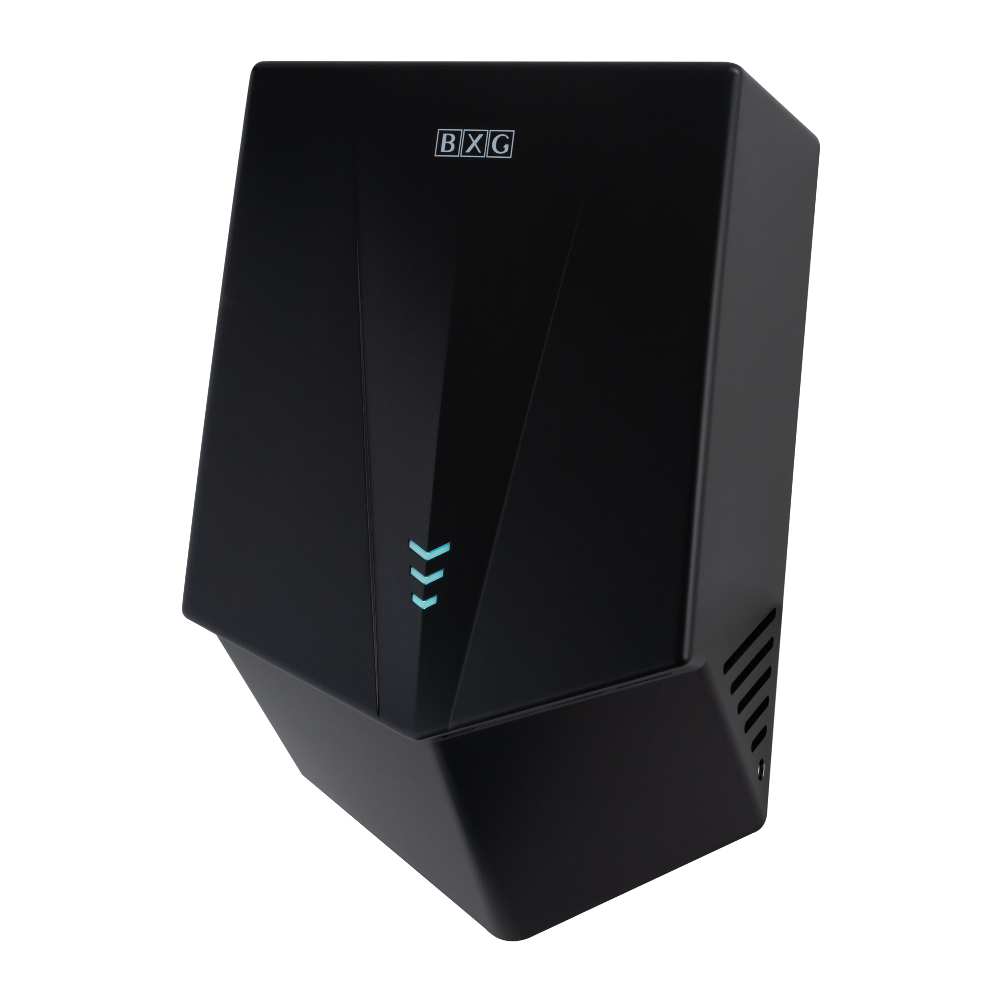 BXG-JET-5700D – Высокоскоростная электросушилка сушилка для рук нового поколения с функцией Ультрафиолетового обеззараживания. Сушилка выполнена из высокопрочного пластика ABS в благородном черном цвете с матовым оттенком.
