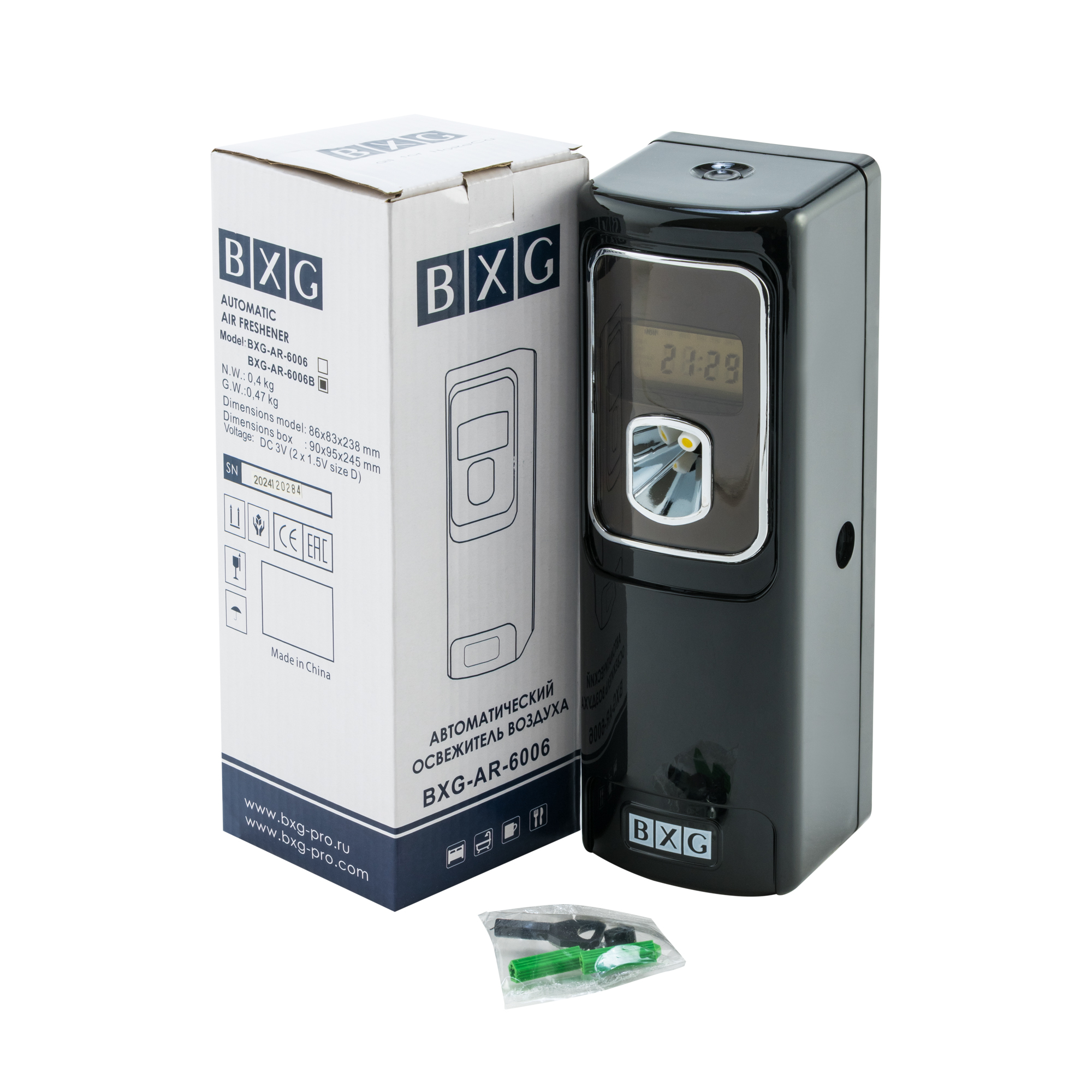 BXG-AR-6006B – Автоматический освежитель воздуха. Предназначен для ароматизации воздуха и у поглощения неприятных запахов в туалетных и ванных комнатах, а также в любых других комнатах жилых и не жилых помещений.