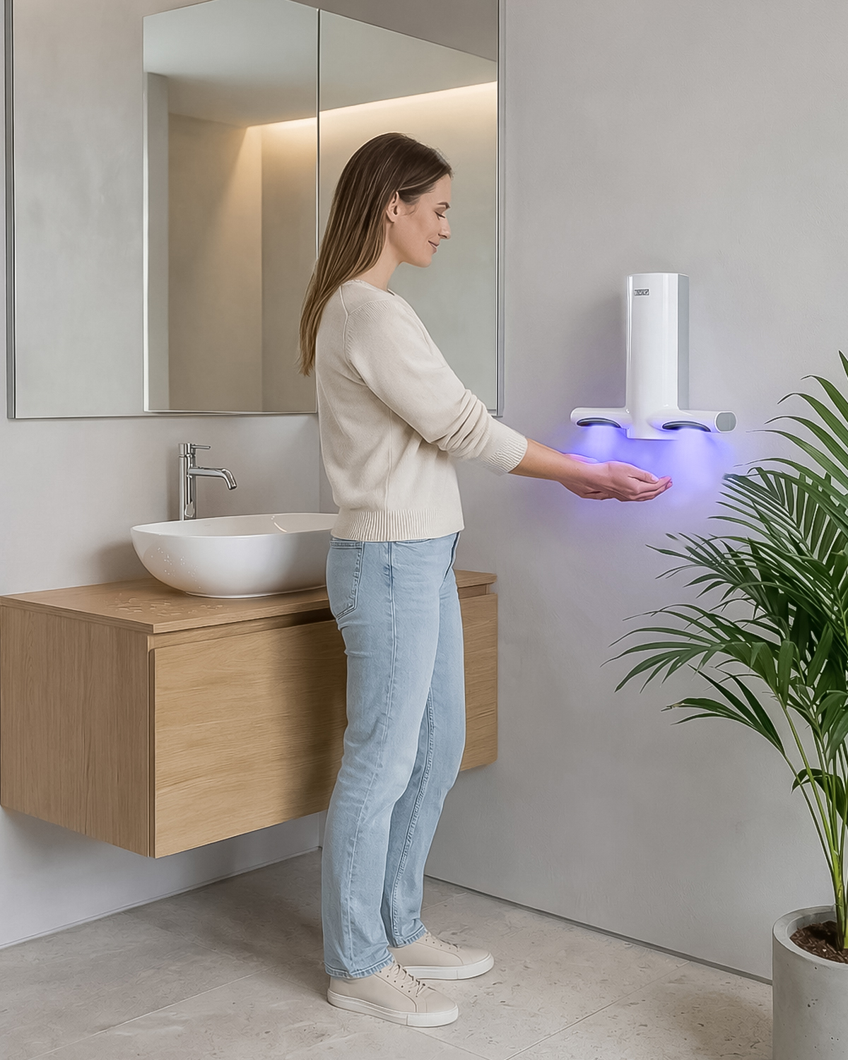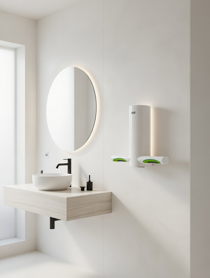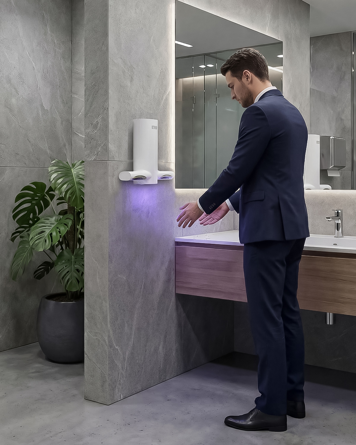 Экологичность: Сушилка изготовлена из высококачественных материалов, которые полностью безопасны и не токсичны. Не высокий уровень потребляемой мощности + EAS система + высокая скорость сушки рук - все это значительно экономит электроэнергию.