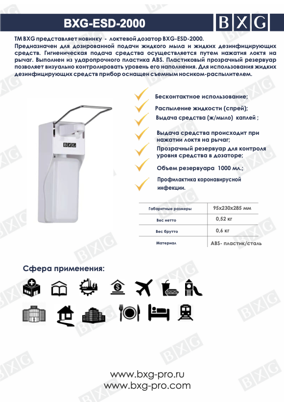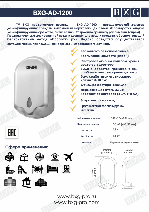 Модель BXG-AD-1111 – самый доступный автоматический дозатор дезинфицирующих средств и при этом такой же качественный как вся продукция ТМ BXG.