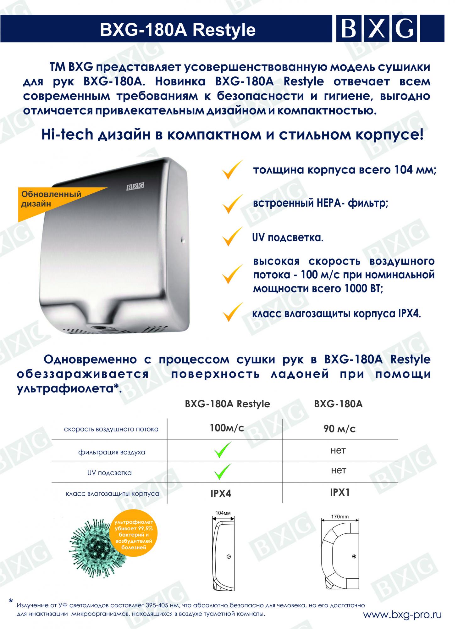 TM BXG представляет усовершенствованную модель сушилки для рук BXG-180A. Новинка BXG-180A Restyle отвечает всем современным требованиям к безопасности и гигиене, выгодно отличается привлекательным дизайном и компактностью.
