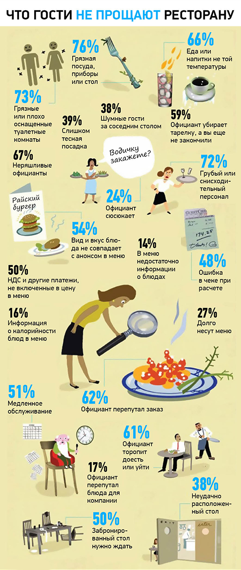 Ниже приведен ранжированный инфографик «непростительных промахов ресторанов», и на втором месте (73%) один из острейших вопросов – недовольство оборудованием для туалетных комнат. Согласитесь не приятно когда у Вас великолепный ресторан, высокая кухня, а гость больше не вернется из-за плохо работающей электросушилки для рук или подтекающего дозатора для жидкого мыла…